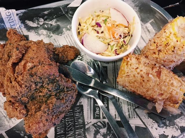 Corn, Kimchi coleslaw and 2 pieces of Bad Bird chicken. I did not order some rice. Haha.I am on a diet. Lelz.